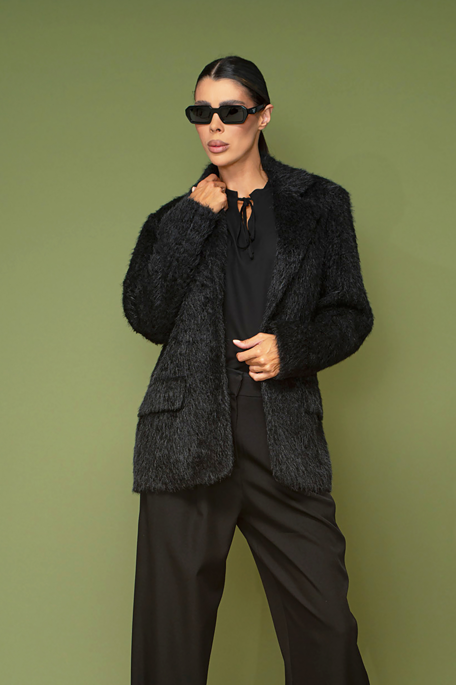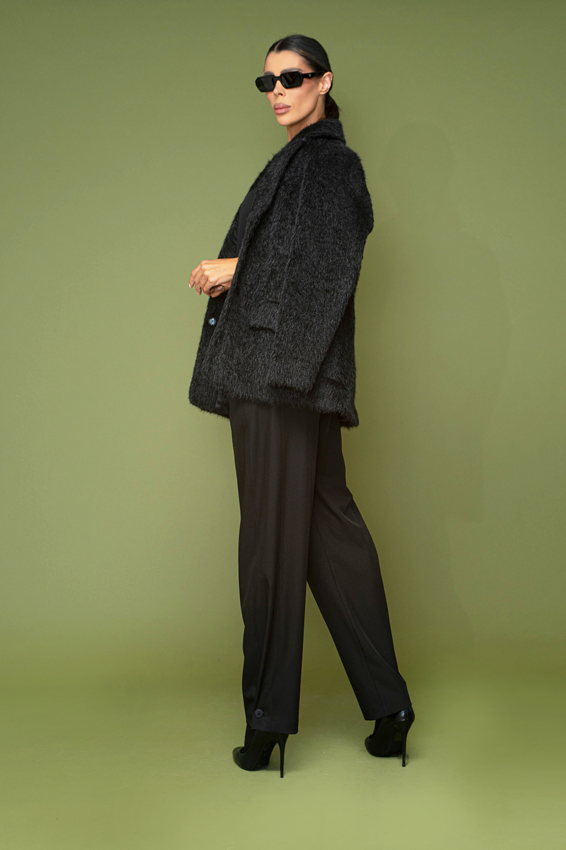 Acest palton are o croială sofisticată care cade elegant până în partea superioară a coapsei. Gulerul este cu rever, iar zona taliei are o legatura elastica reglabila care accentueaza silueta si adauga confort.